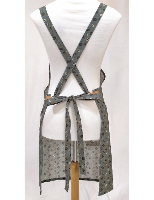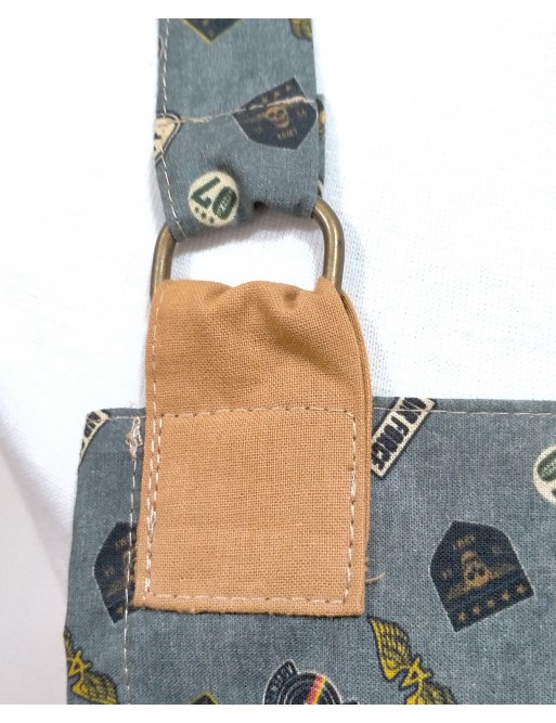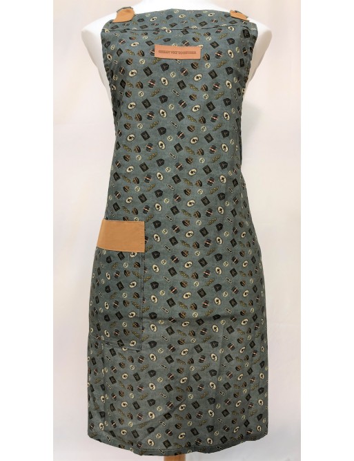 Delantal de cocina hecho con nuestra tela Trend Air Force y detalles con nuestra tela Les Unis en color Camel.